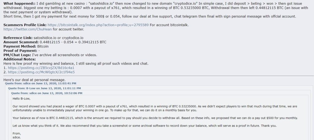Un compañero de juego criptográfico informó en bitcointalk de que había ganado alrededor de 0,5 BTC en el sitio. Cryptodice.io se puso en contacto con él y le dijo que no esperaban que nadie ganara tanto (estamos hablando de un casino…) y que no podían pagarle sus ganancias en un solo pago. En su lugar, le ofrecieron un pago mensual de 500$. Esto justifica por sí solo la inclusión en la lista negra, ya que no se puede dirigir un casino con semejante “fondo”, obviamente insolvente… Pero aún es peor: el jugador acordó pagos mensuales, pero no ha recibido el último pago, se le ignora e incluso se le bloquea en Telegram sin ninguna comunicación. Esto es poco profesional y turbio. ¡Aléjate de Cryptodice.io!