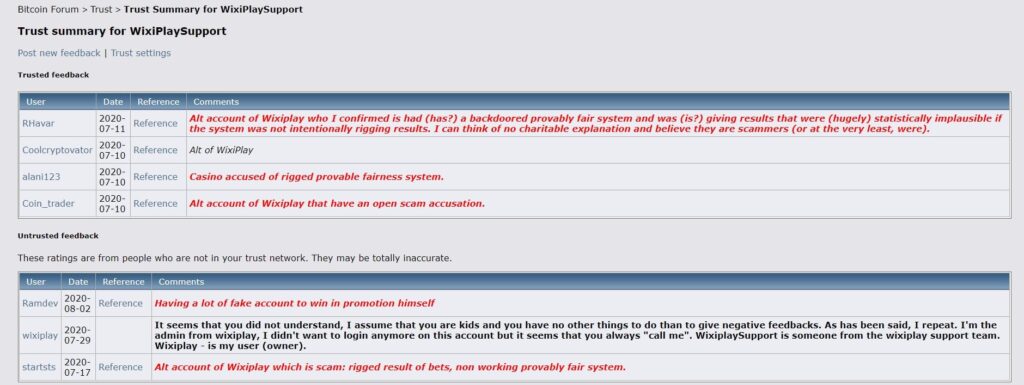 Wixiplay.io afirma proporcionar juegos provably fair– La “buena noticia” es que usuarios experimentados en bitcointalk.org descubrieron y compartieron pruebas de que los juegos de wixiplay no son provably fair/ los resultados pueden ser manipulados. Wixiplay.io fue etiquetado y volvió al cabo de unos meses, afirmando que habían renovado su algoritmo provably fair. ¿Adivina qué? Sus juegos siguen sin ser provably fair. Además, hay varias acusaciones de estafa no resueltas por parte de jugadores que no han recibido sus retiros.