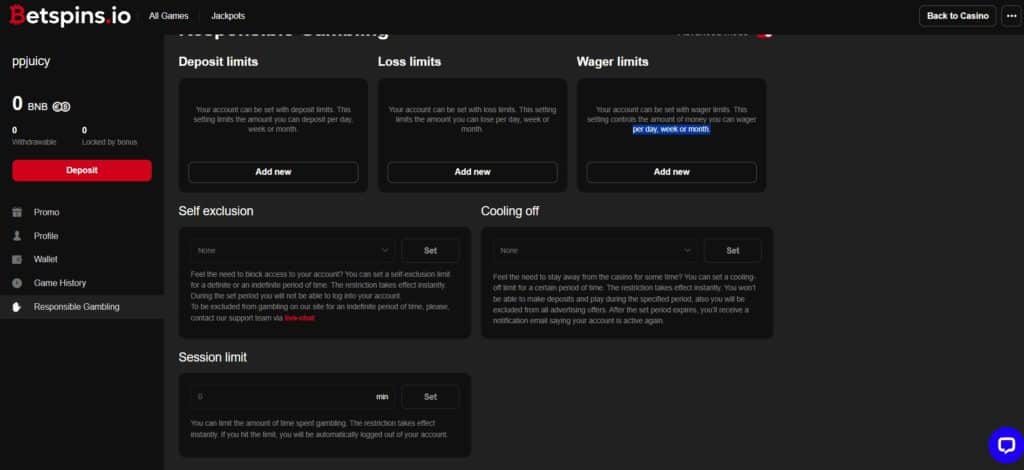Betspins.io tiene un certificado de seguridad Let’s Encrypt E1, que indica la implementación de una Clave Pública de Curva Elíptica. Puedes configurar 2FA aquí. Y puedes reseñar tu historial de sesiones desde dentro de tu página de perfil, que también te permite consultar tu historial de transacciones y juegos. Tiene una sección de juego responsable donde puedes establecer límites de pérdidas, sesiones y apuestas y activar periodos de reflexión. Si haces clic en el conmutador de opciones avanzadas de esta página, aparecerá una opción para activar una prohibición de autoexclusión. Proporcionará periodos de autoexclusión de seis meses, nueve meses y un año.