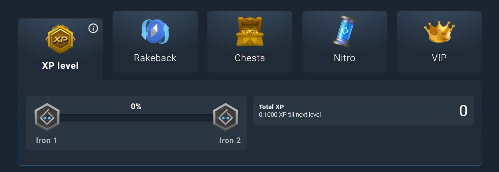 Los niveles dentro de este sistema son Hierro, Bronce, Plata, Oro, Platino, Diamante, Diamante Negro, Maestro Diamante y Leyenda Diamante. Éstos tienen subniveles, y el sitio no descarta introducir más próximamente. Al subir de nivel, ganas cofres, Rakeback y otras recompensas.