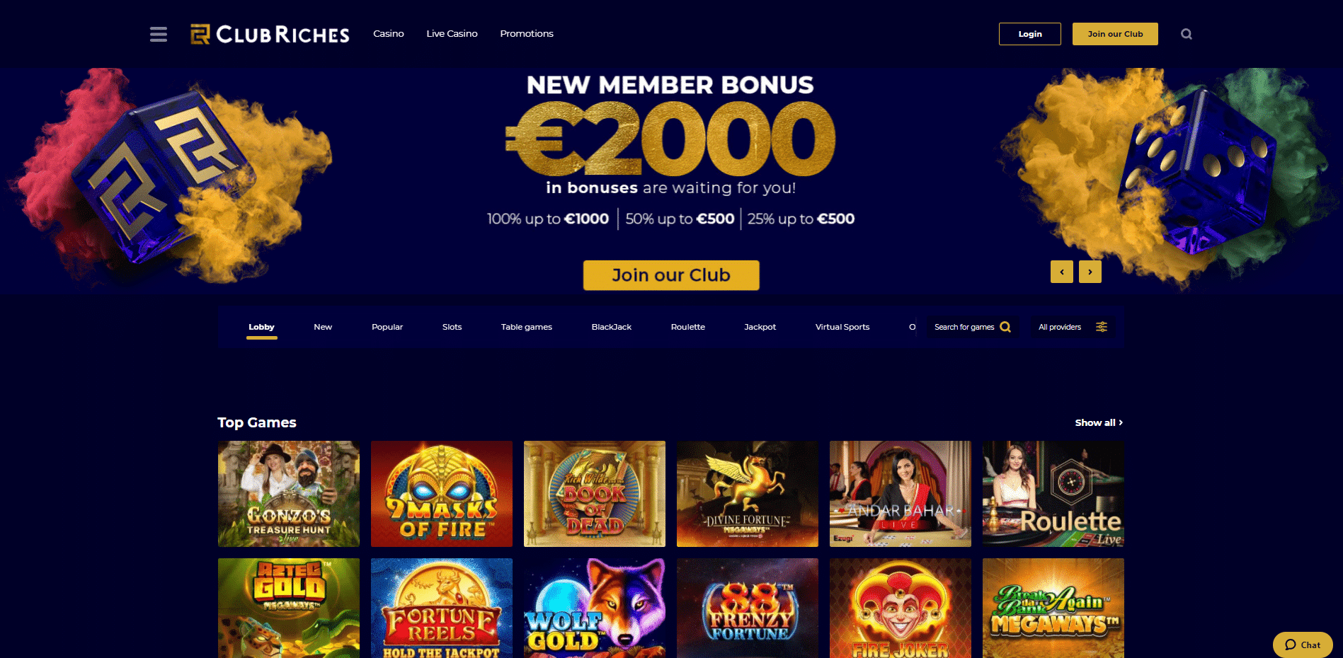 Empezar en ClubRiches es muy fácil. Si pulsas el botón “Únete a nuestro club”, podrás elegir tu paquete de bienvenida (si es que quieres uno) y, a partir de ahí, podrás avanzar e introducir tus datos en el formulario electrónico para completar el proceso de inscripción. Una vez registrado, tu bonificación debería estar disponible en cuanto realices tu primer depósito. Después de eso, es hora de empezar a buscar los mejores juegos para jugar, así que veámoslos a continuación.