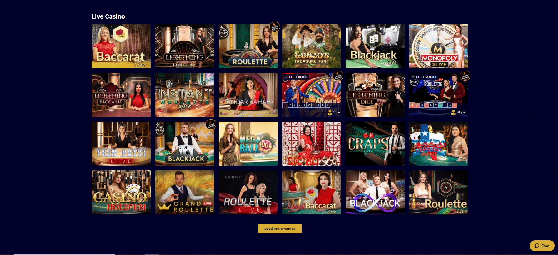 Más de treinta proveedores, tanto establecidos como noveles, complementan la biblioteca de juegos del casino. Entre estos desarrolladores destacan BetSoft Gaming, ELK Studios, Evolution Gaming, Ezugi, iSoftBet, Microgaming, NetEnt, No Limit City Studios, Play ‘n Go, Pragmatic Play, Red Tiger Gaming, Spinomenal, Thunderkick e Yggdrasil Gaming. Puedes buscar los juegos del casino por su software o utilizar un cuadro de búsqueda genérico para encontrar un título específico.