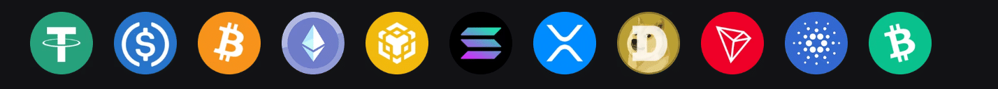 Bitcoin (BTC), USD Coin (USDC), Solana (SOL), Tron (TRX), Ripple (XRP), Tether (USDT), Ethereum (ETH), Dogecoin (DOGE), Binance Coin (BNB-BSC) y Bitcoin Cash (BCH).