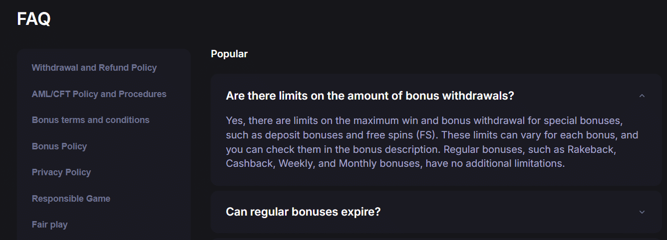 Las condiciones generales de MineBit son muy detalladas. Son de las más extensas que hemos visto. Las copiamos todas en un documento de Word y obtuvimos más de sesenta páginas sin saltos de línea. Como siempre, diremos que la imparcialidad es subjetiva, pero las condiciones aquí expuestas hacen un buen trabajo explicando las obligaciones del jugador. En general, son suficientemente transparentes, aunque odiamos que tengas que seguir pulsando “cargar más” para ver más información en todas las páginas de condiciones. Es molesto y dificulta la búsqueda rápida.