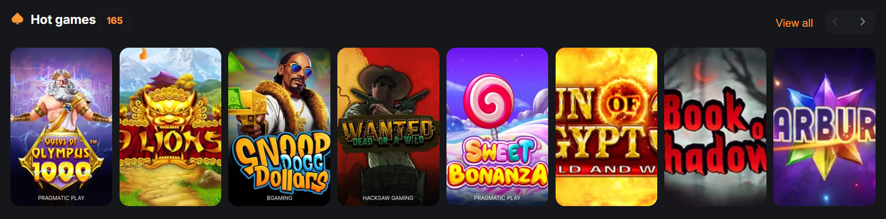 Parece robusto, con varios miles de juegos (desconocemos la cifra exacta) de unos cuarenta proveedores que se dividen en las siguientes categorías: Favoritos, Recientes, Bonos de apuestas, Tragaperras, Juegos calientes, Juegos nuevos, Juegos instantáneos, Casino en vivo, Espectáculos de juegos, Blackjack, Ruleta y Juegos VIP.