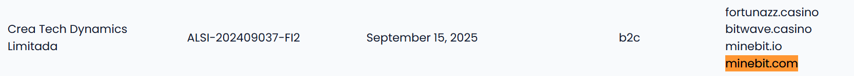 A juzgar por su licencia, el mismo operador que gestiona MineBit también ha obtenido la aprobación para gestionar otros dos sitios. Se trata de fortunazz.casino y bitwave.casino. Este último es un dominio en funcionamiento, pero Fortunazz no parecía estar operativo cuando lo comprobamos.