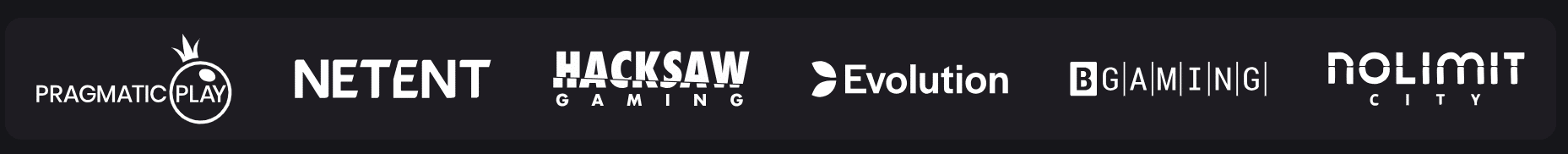 Son: Pragmatic Play, NetEnt, Hacksaw Gaming, Evolution, BGaming, Nolimit City, Red Tiger, 3 Oaks Gaming, Live88, Playson, Spinomenal, Betsoft, Endorphina, AvatarUX, Pocket Games Soft (PG Soft), Gamzix, Mascot, Belatra, VoltEnt, Red Rake Gaming, GameArt, Smartsoft Gaming, Slotmill, Aviatrix, Spribe, Turbo Games, Onlyplay, Popiplay, OneTouch, Evoplay, Ezugi, Blueprint Gaming, Habanero, Microgaming, Peter & Sons, Platipus, Retro Gaming, Shady Lady, TrueLab y Big Time Gaming.
