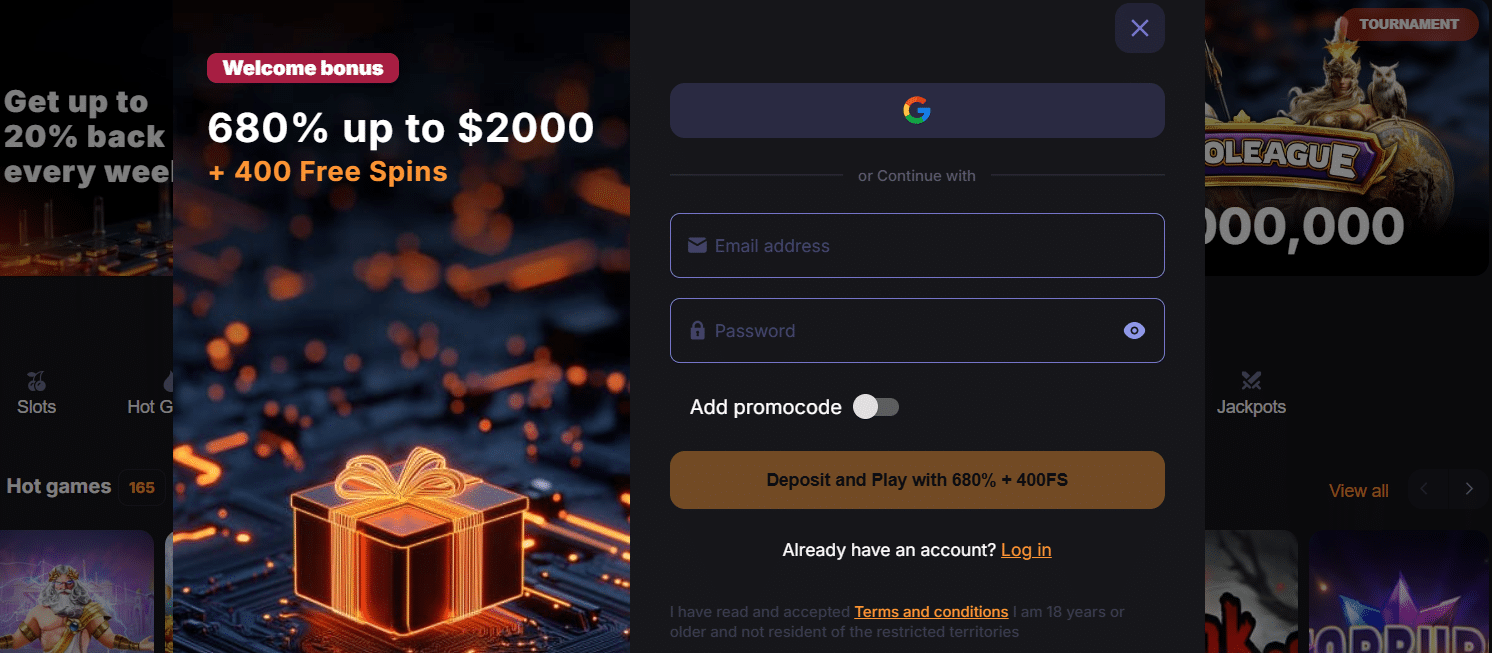 Puedes unirte aquí compartiendo las credenciales de tu cuenta de Google o introduciendo tu correo electrónico y una contraseña para tu cuenta. Al hacer esto último, al seguir ese camino, declaras que has leído y aceptado los Términos y Condiciones, que no procedes de una región restringida y que tienes más de dieciocho años o la edad legal para jugar en tu país.