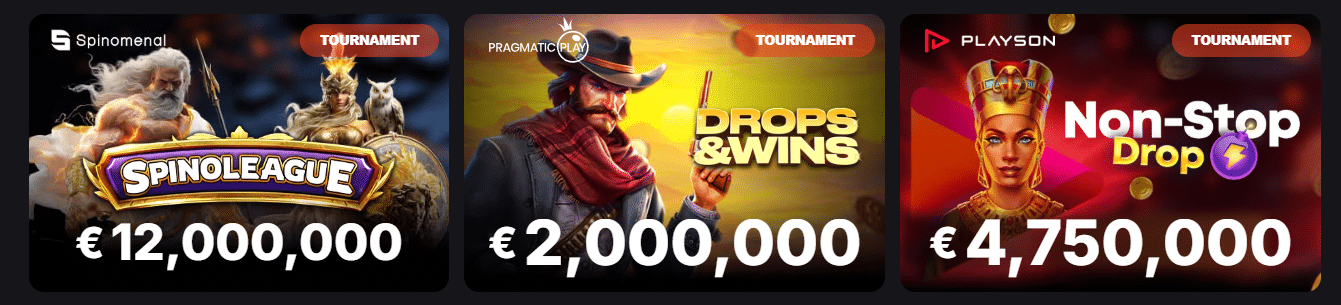 El sitio cuenta con concursos organizados por el proveedor. Cuenta con el Non-Stop Drop de Playson, que ofrece una bolsa de premios de 4.750.000 € con premios aleatorios Cash Blast que se activan con tiradas de 0,20 € en la clasificación. También se presenta aquí la promoción Drops & Wins de Pragmatic Play, que incluye Torneos Diarios y Premios Semanales que requieren apuestas de 0,15 € o superiores en títulos específicos de este proveedor.