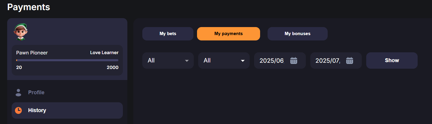 Tienes Misiones, que son tareas con las que obtienes recompensas como dinero, bonificaciones y puntos de experiencia. Las misiones van desde acciones básicas como confirmar un correo electrónico hasta realizar apuestas específicas. A medida que subes de nivel, estas misiones se vuelven más complejas y ofrecen mayores recompensas.