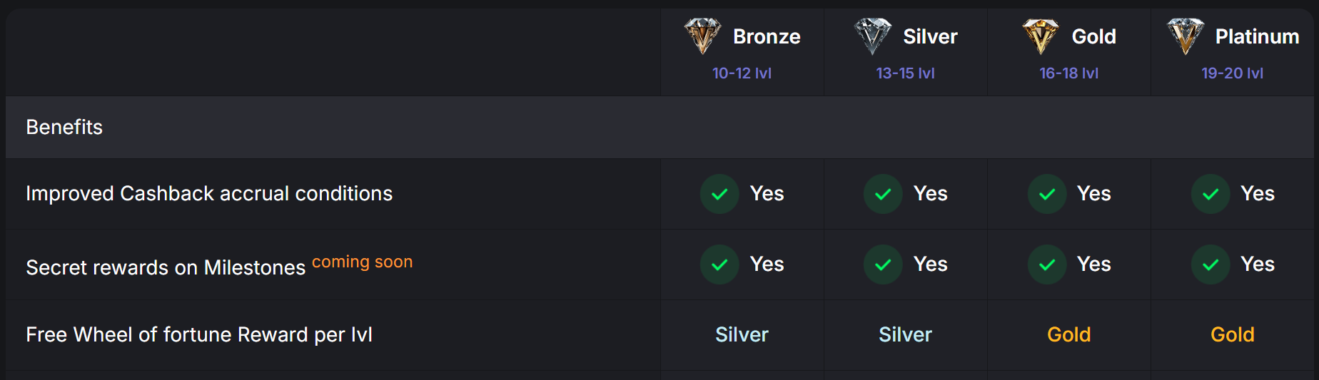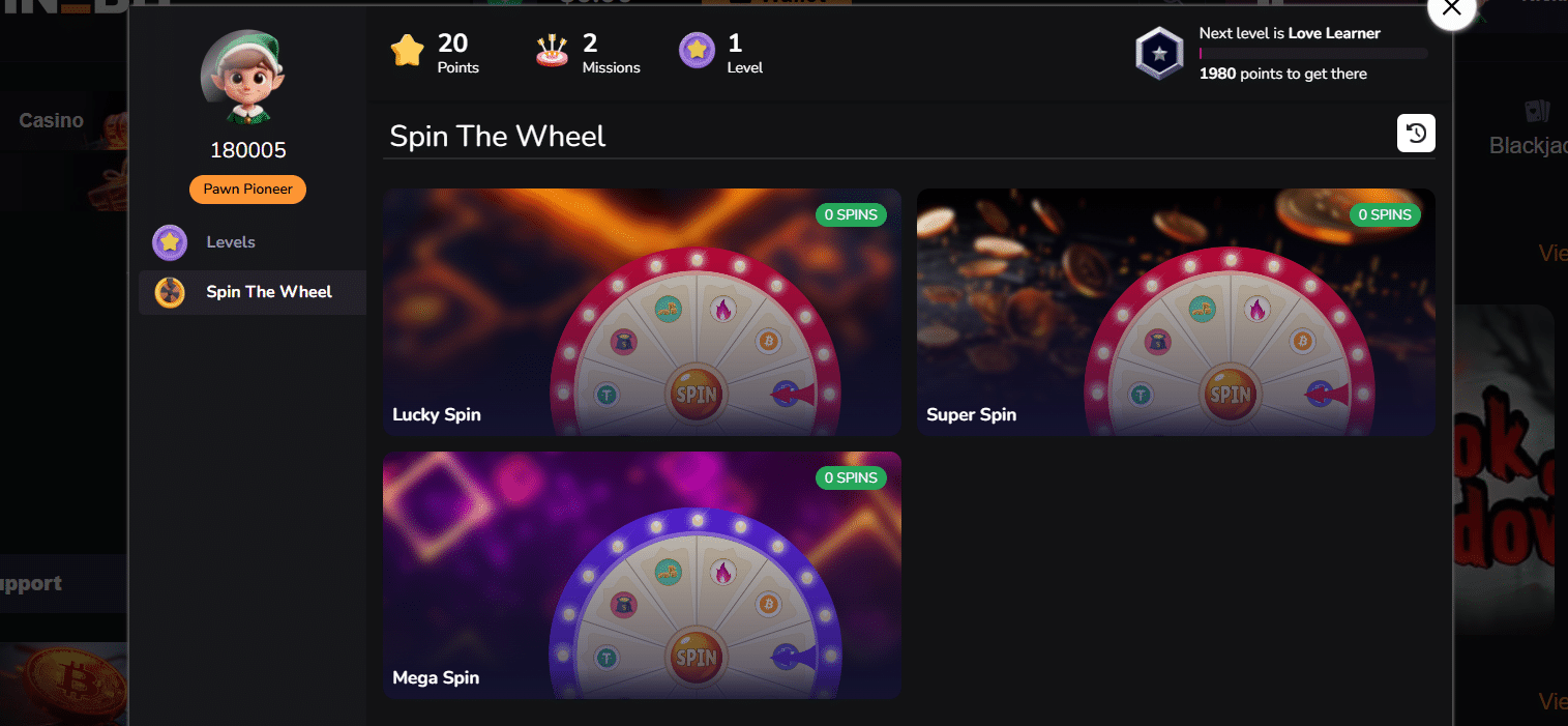 Así, empiezas en el programa de fidelización estándar en el Nivel 1. Asciendes en este sistema jugando y apostando, lo que te hace ganar puntos de experiencia a razón de uno por cada dólar apostado. Los veinte niveles desbloquean ventajas progresivamente mejores, que consisten principalmente en devoluciones de dinero, bonificaciones por recarga, misiones personales, giros de rueda y regalos de cumpleaños. Los niveles iniciales, como Peón Pionero, ofrecen pequeñas ventajas, mientras que los niveles medios, como Caballero Codificador o As del Algoritmo, ofrecen mejores recompensas.