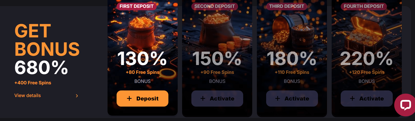 La bonificación del primer depósito es una igualación del 100% con treinta tiradas gratuitas. El segundo es una bonificación del 110% con sesenta (mínimo de 80 $), y el tercero es una bonificación del 130% con ochenta tiradas (mínimo de 120 $). El cuarto depósito de este paquete concede una bonificación del 220% con ciento veinte rondas de juego gratuitas por un depósito mínimo de 300 $.
