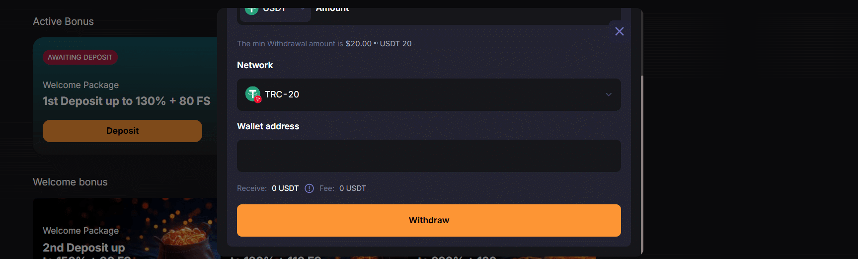 - Opciones de depósito BCH, BNB-BSC, BTC, DOGE, ETH, SOL, TRX, USDC, USDT, XRP
