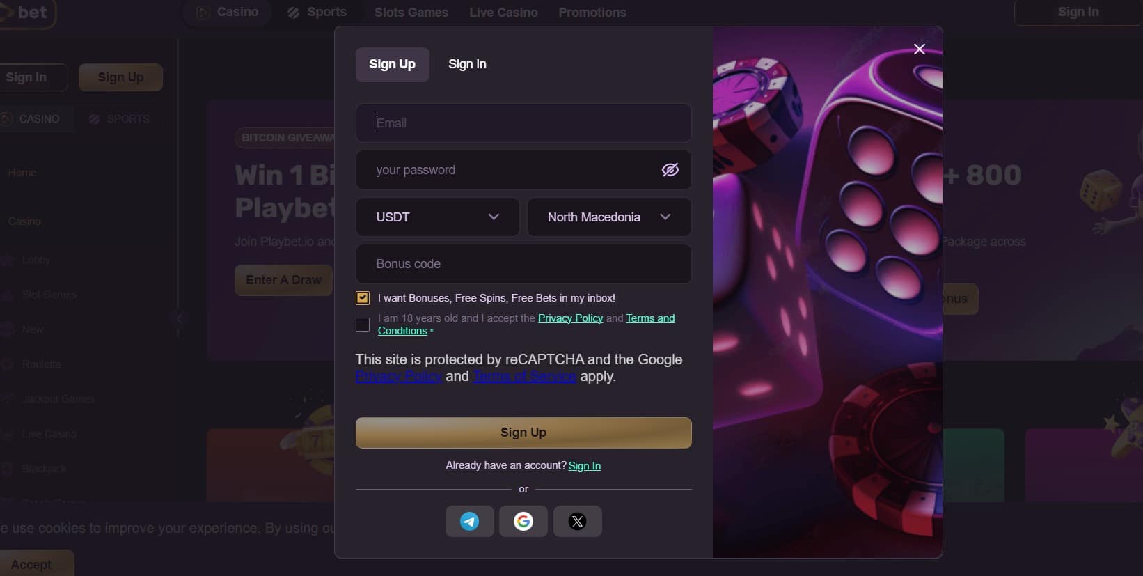 El proceso de registro en Playbet.io le pide su correo electrónico, que introduzca una contraseña, que elija una divisa y que revele su país de residencia. Una vez hecho esto, deberá verificar su cuenta de Playbet.io haciendo clic en un enlace que se le enviará a su bandeja de entrada. Si no sigues este procedimiento de registro estándar, puedes optar por unirte a este centro utilizando tus credenciales de Telegram, Google o X.