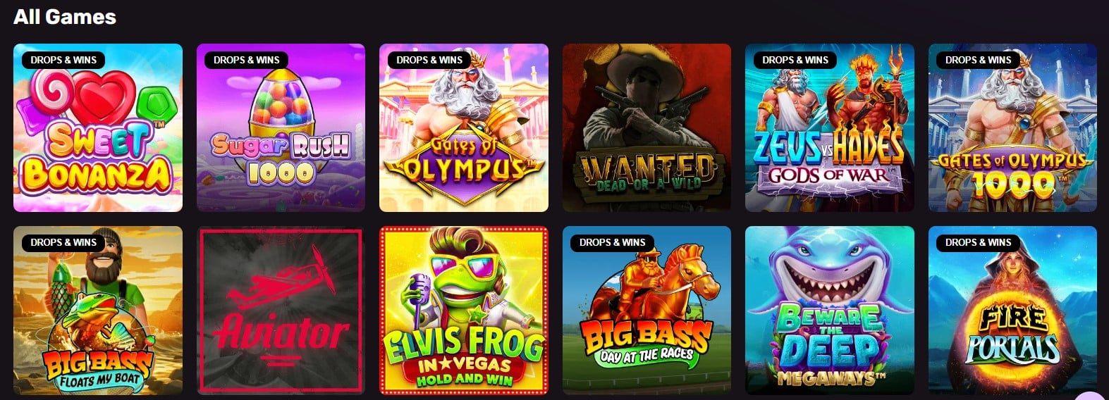 Puedes navegar por los productos de este sitio echando un vistazo sólo a las tragaperras, las nuevas incorporaciones a la plataforma, los picks de ruleta, los de blackjack, los spinners de jackpot, las mesas en vivo, los títulos de cartas y los de crash. También hay una pestaña dedicada a las tragaperras elegibles Drop & Win de Pragmatic Play. Puedes encontrar juegos con los que estés familiarizado a través de la función de búsqueda, y puedes comprobar lo que aporta cada proveedor destacado utilizando un menú desplegable de proveedores.