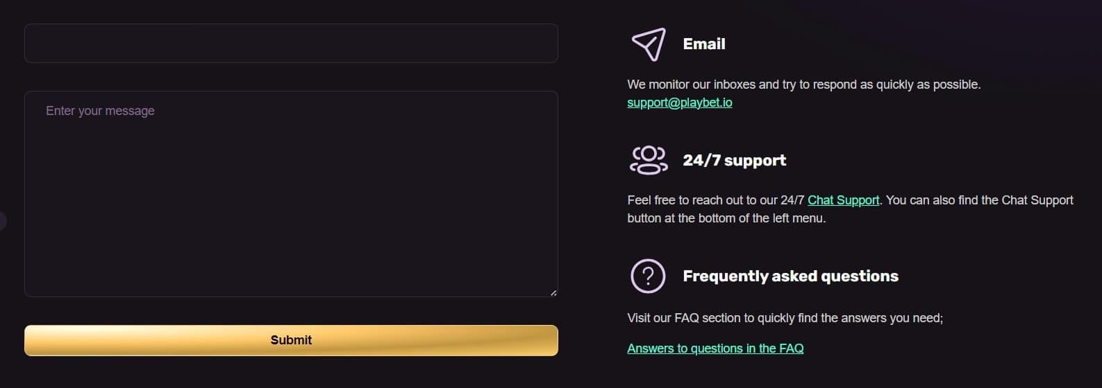 Playbet.io cuenta con una página dedicada a las preguntas más frecuentes que contiene veinticuatro preguntas y respuestas generales, pero también encontrará preguntas más frecuentes en la mayoría de las páginas del sitio. El correo electrónico de soporte de esta plataforma es support@playbet.io. Lo probamos, y nos dio una respuesta a nuestra pregunta en treinta y dos minutos. Fue una respuesta satisfactoria.