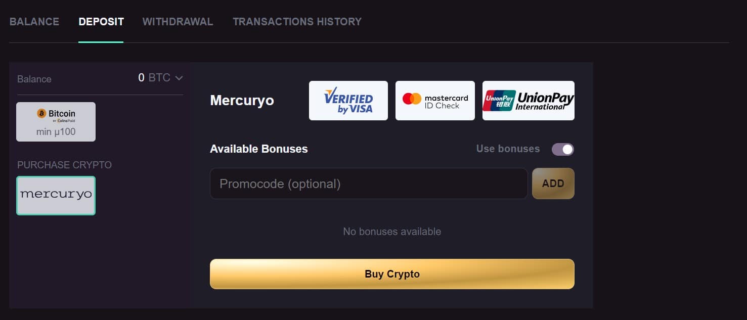 Si no tienes monedas, puedes comprar algunas usando Mercuryo, desde dentro de la pestaña del cajero.