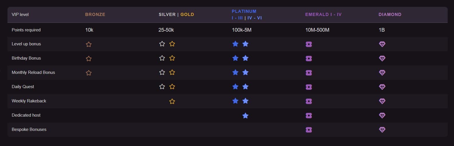 En este sistema, los puntos se obtienen en función de la cantidad apostada, y las tragaperras contribuyen más a la obtención de puntos que otros juegos. La tasa de acumulación de puntos es de un punto por cada 1 USDT apostado en tragaperras. Si juega a títulos de otros géneros de juego, su tasa de acumulación será de un punto por cada 5 USDT apostados. Tenga en cuenta que los niveles VIP más bajos tienen requisitos de apuesta más altos, mientras que los de nivel superior como Esmeralda y Diamante disfrutan de unos requisitos reducidos. Una vez alcanzado un determinado estatus, éste es permanente. Aun así, debes seguir jugando para mantener el acceso a los beneficios activos. Así que no es exactamente así. Para convertirse en usuario de nivel Bronce, necesita diez mil puntos, y para alcanzar el estatus Diamante, necesita mil millones.