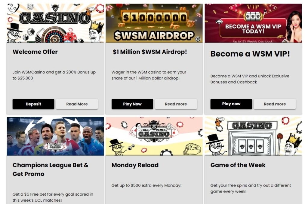 Existe un ecosistema simbólico en WSM Casino, que presume de un lanzamiento aéreo de 1 millón de dólares, dividido en temporadas mensuales, y de apostar por una tasa de recompensa anual estimada del 32%. Supuestamente, la comunidad de WSM es de 1,1 millones de personas, y los usuarios existentes del sitio disfrutan de una promoción de Recarga de los Lunes que ofrece hasta un 50% extra en los depósitos de los lunes. Los depósitos de entre 50 y 199 $ obtienen una bonificación del 30%, mientras que los de entre 200 y 499 $ reciben un 40%. Los depósitos de 500 $ a 1.000 $ dan una bonificación del 50%, y los que superan los 1.000 $ aseguran 500 $. Tienen un plazo de cinco días, un límite máximo de apuesta de 5 $ y un requisito de apuesta de x35. Por último, tienes la promoción Juego de la Semana en WSM, que te da la oportunidad de explorar un juego novedoso cada semana, ganando tiradas en la casa al completar misiones.