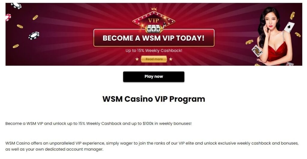 Sin embargo, justo cuando estábamos a punto de publicar esta reseña, vimos que se había añadido una página del programa VIP de WSM. En ella se explica que el sistema de fidelidad tiene cuatro niveles. Alcanzas el nivel inicial apostando aquí más de 70.000 $. El programa anuncia hasta un 15% de devolución semanal, hasta 100.000 $ en bonificaciones semanales, giros gratis, retiradas instantáneas, un gestor VIP y mucho más.