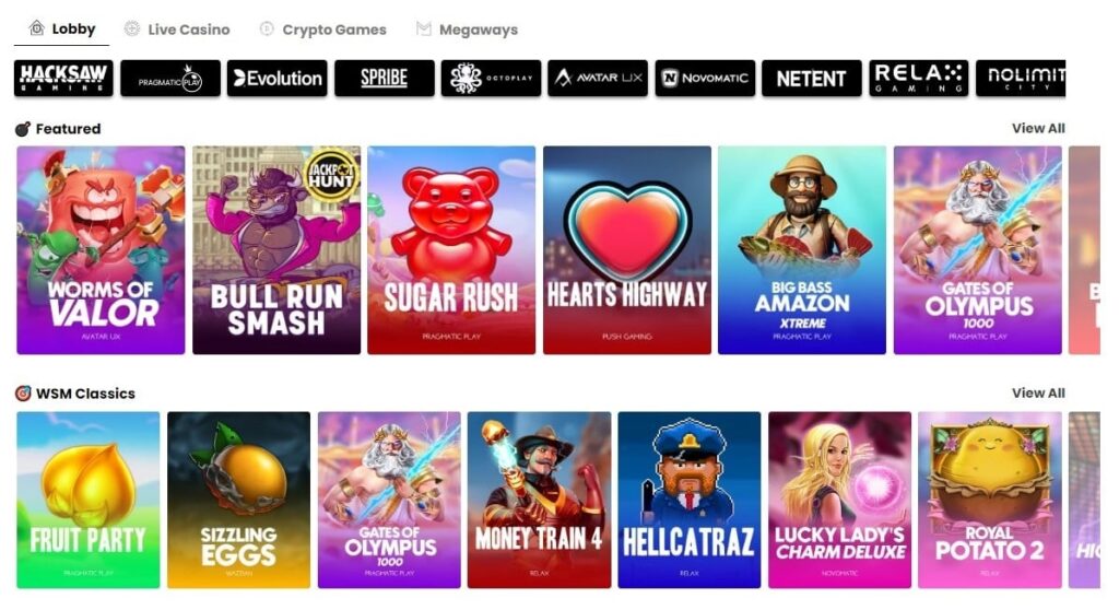 El vestíbulo de juegos de este sitio cuenta con miles de juegos de cuarenta y un proveedores, una mezcla de proveedores de productos de esfera establecida como Pragmatic Play, Hacksaw Gaming, Nolimit City, Relax Gaming, NetEnt, BetSoft, BluePrint, Wazdan, BigTime Gaming, Playson y Elk Studios. Además, entidades menos conocidas de la industria como Gamomat, Fantasma Games, Pocket Game Soft, Rouge y Octoplay. Los títulos proporcionados por estos proveedores se organizan en cuatro categorías principales. Éstas son Vestíbulo, Criptojuegos de Casino en Vivo y Megajuegos. La primera sección alberga principalmente tragaperras divididas en Destacadas, Clásicas WSM, Top Picks, Smash, Game Shows, Nuevos Juegos y Bonus Buy. Por lo que sabemos, en esta zona de la plataforma no puedes hacer demostraciones de ningún producto.
