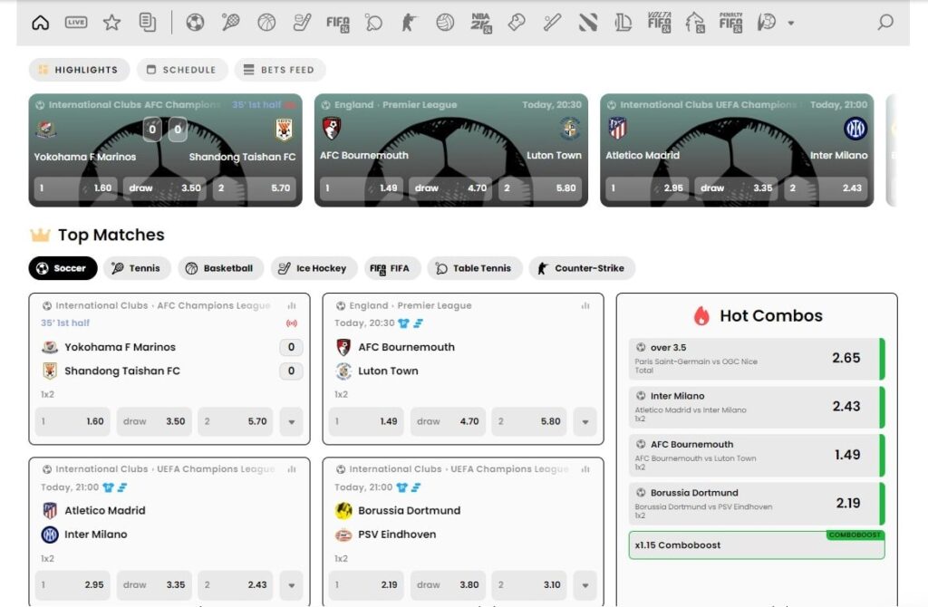 Los deportes a los que puedes apostar en esta casa de apuestas por Internet son Futsal, FIFA, MMA, Aussie Rules, Tenis, Hockey sobre hielo, Baloncesto, Béisbol, Balonmano, Voleibol, Boxeo, Olimpiadas, Rugby, Tenis de mesa, Penaltis, Bádminton, Bandy, Fútbol, Snooker y Fútbol americano. Las opciones de eSports son eCricket, StarCraft, FIFA, Arena of Valor, Mobile Legends, Dota, eShooter, eTennis, Call of Duty, FIFA: Volta, Counter-Strike, eSoccer, eRocket League, Overwatch, eFighting, Penalty Shootout, King of Glory, League of Legends, NBA 2K y StarCraft.
